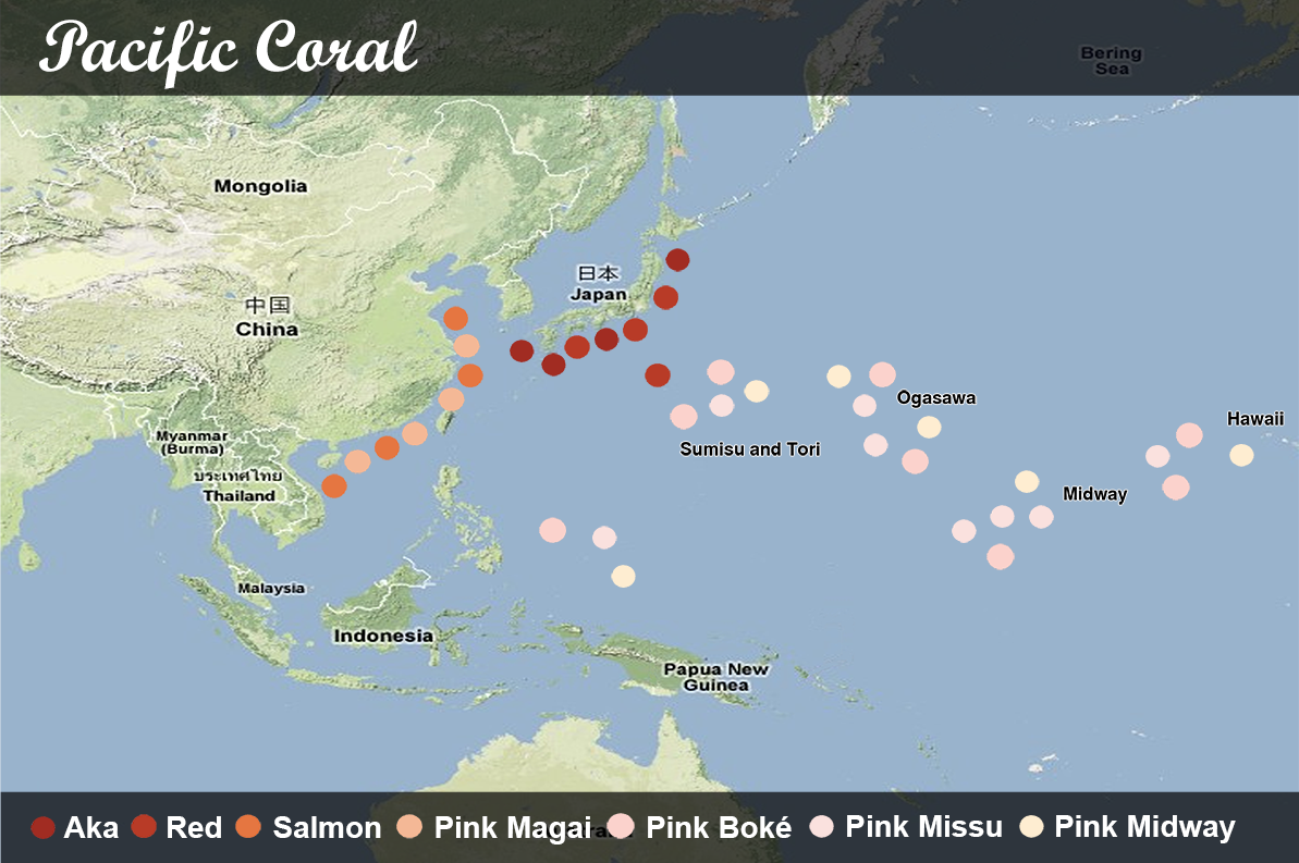 I coralli provenienti dall’ Oceano Pacifico si distinguono in tre sottocategorie determinate dal colore e dalla dimensione: Corallium Elatius, Secundum e Japonicum. Tutti i coralli del Pacifico presentano una tipica venatura bianca sul dorso o al centro, che li distingue da quelli del Mediterraneo.