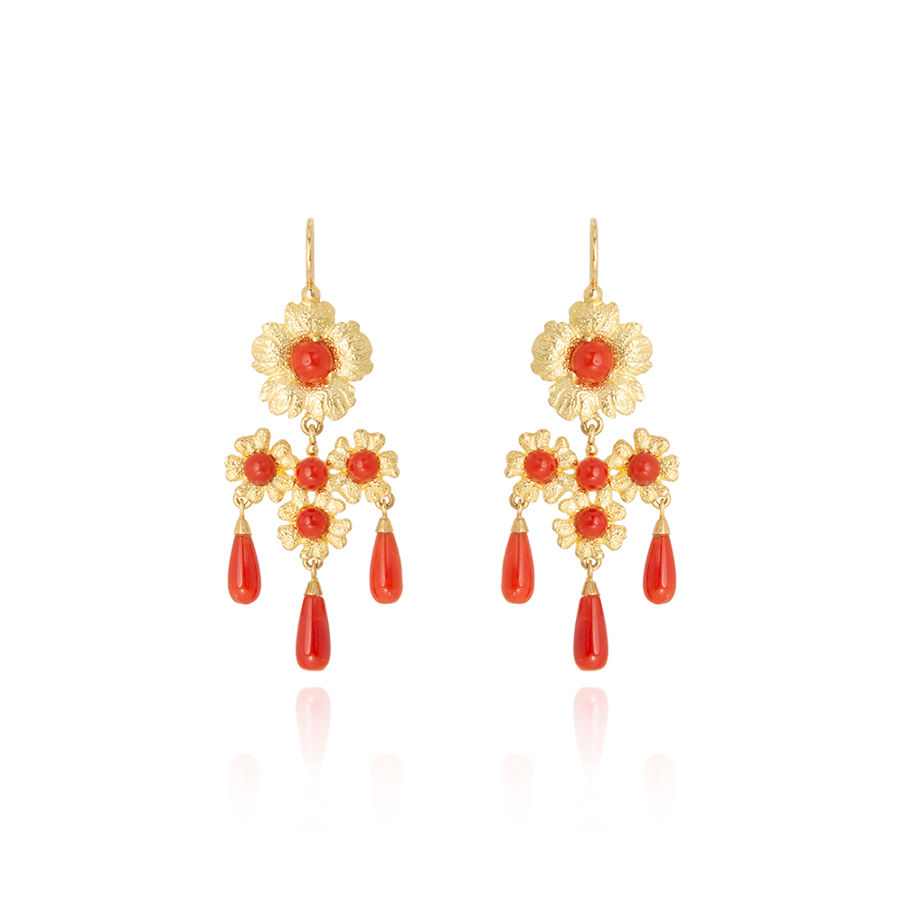 Flowers Earrings with Small Red Coral Round Drops