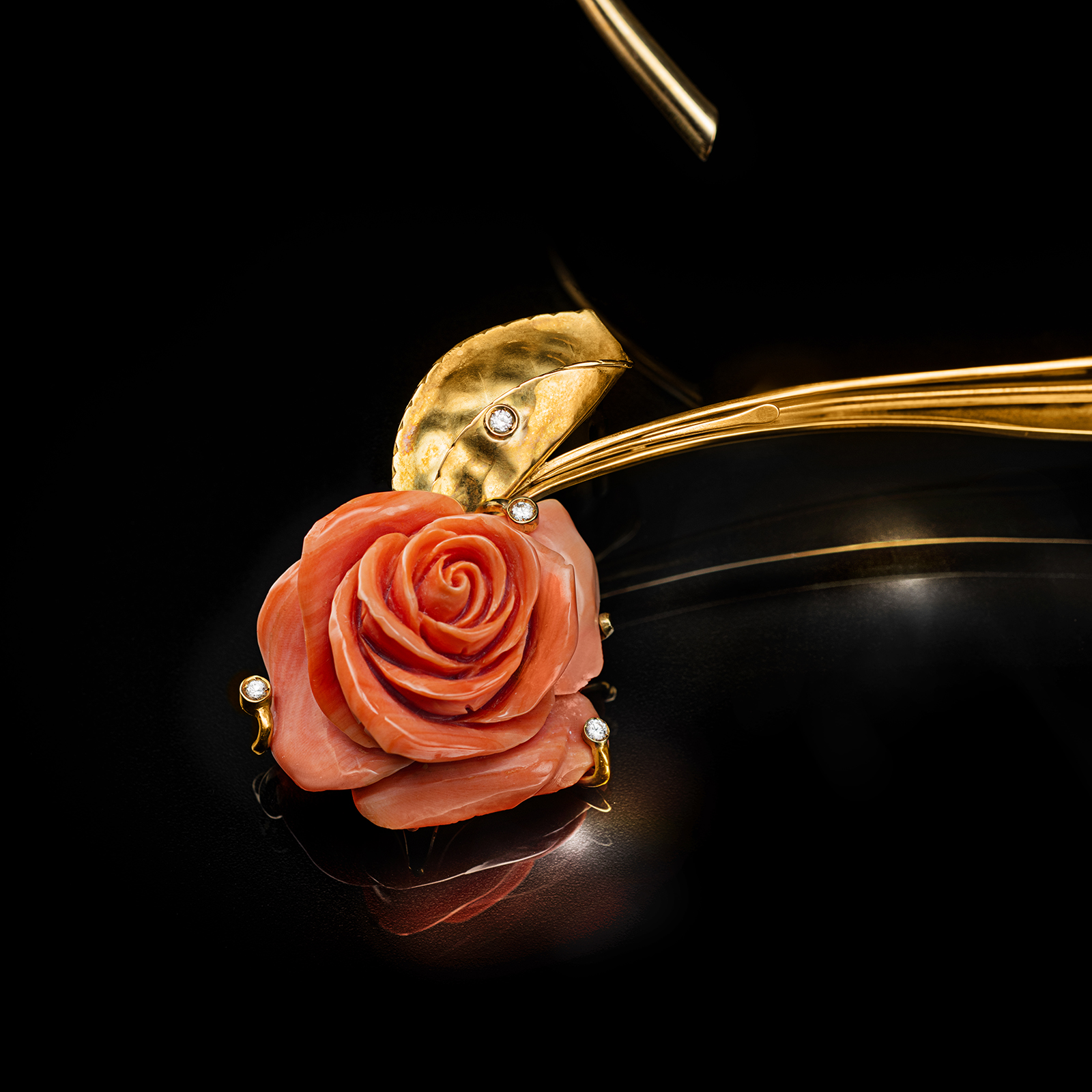 Collier in Oro 18 Kt con Diamanti da 2,47 Kt con Rosa di Corallo Elatius in Pelle D’Angelo