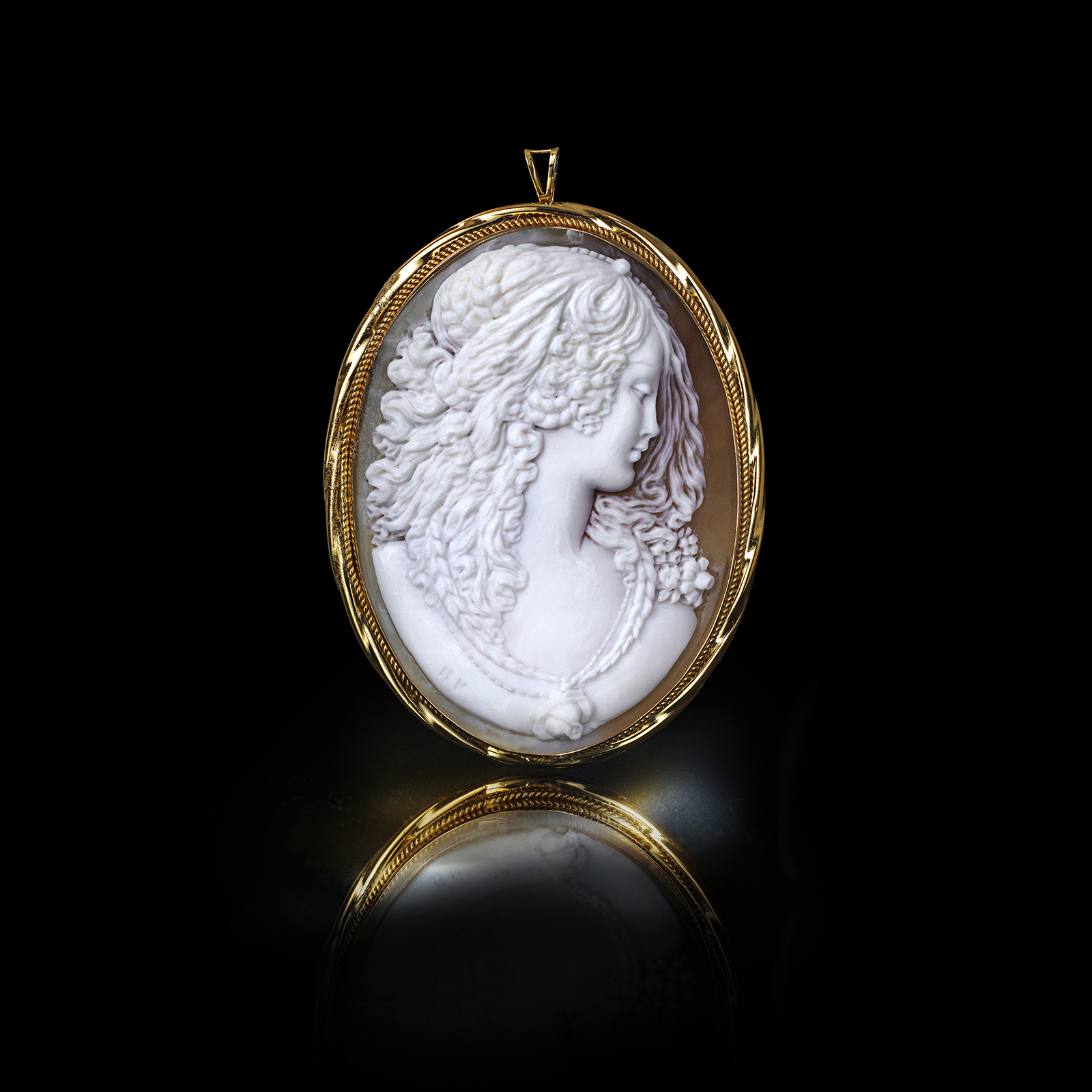 The Sardonix shell origins were mistakenly attributed to the coasts of Madagascar, but actually its natural habitat is the Gulf of Mexico and the Caribbean Sea. Its outer surface has white-to-cream shades, while its internal dark brown layer makes the shell very suitable for the realization of cameos. The strong chromatic contrast between the outer and the inner layers of the shell puts in evidence the representation carved, by arising the design from the bottom surface, as a bas-relief. This contrast creates a great light and shadow effect and emphasizes the depth and the forms of the whole representation. Each step of the shell processing, from the size selection to the shaping and engraving, is still carried out with the local traditional methods.