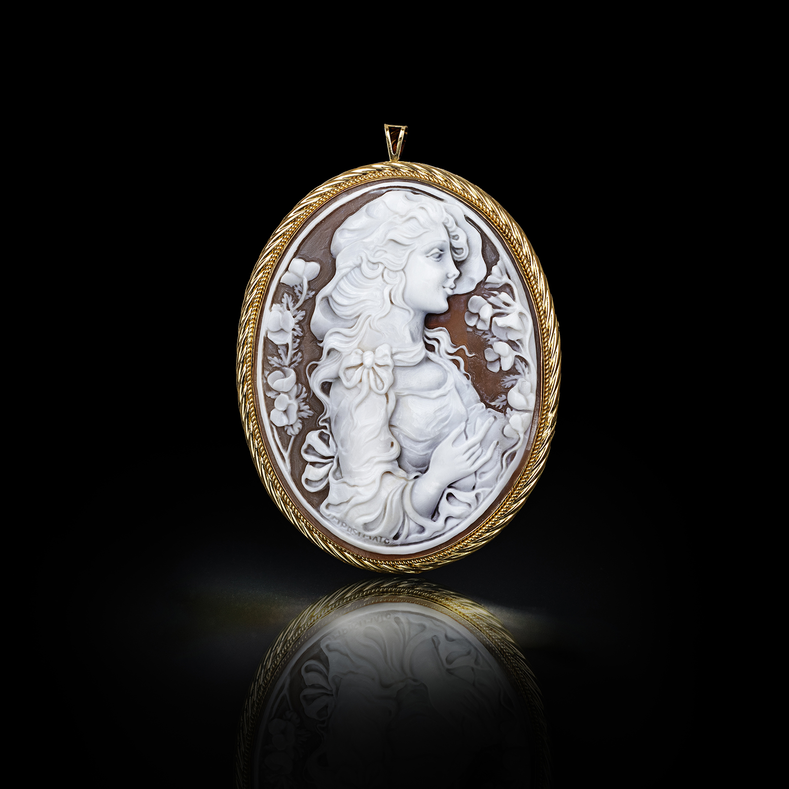 Il forte contrasto cromatico tra l’esterno e l’interno degli strati della conchiglia mette in evidenza la rappresentazione scolpita, creando il modello dalla superficie inferiore, come un bassorilievo. Questo contrasto crea una grande luce e un effetto ombra, enfatizzando la profondità e le forme dell’intera rappresentazione.