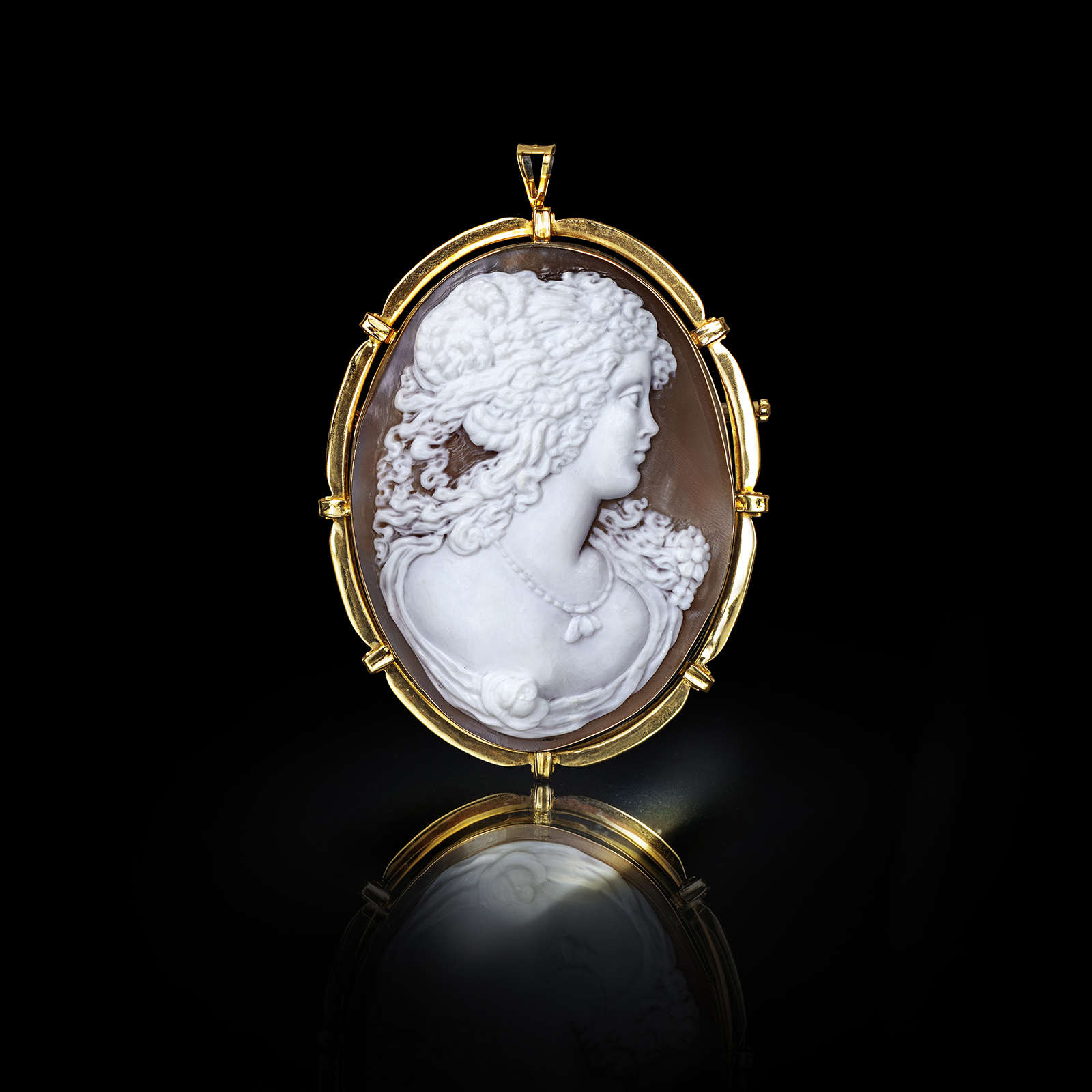 Incisione di volto femminile su cammeo di Conchiglia Sardonica, con montatura in Oro 18Kt