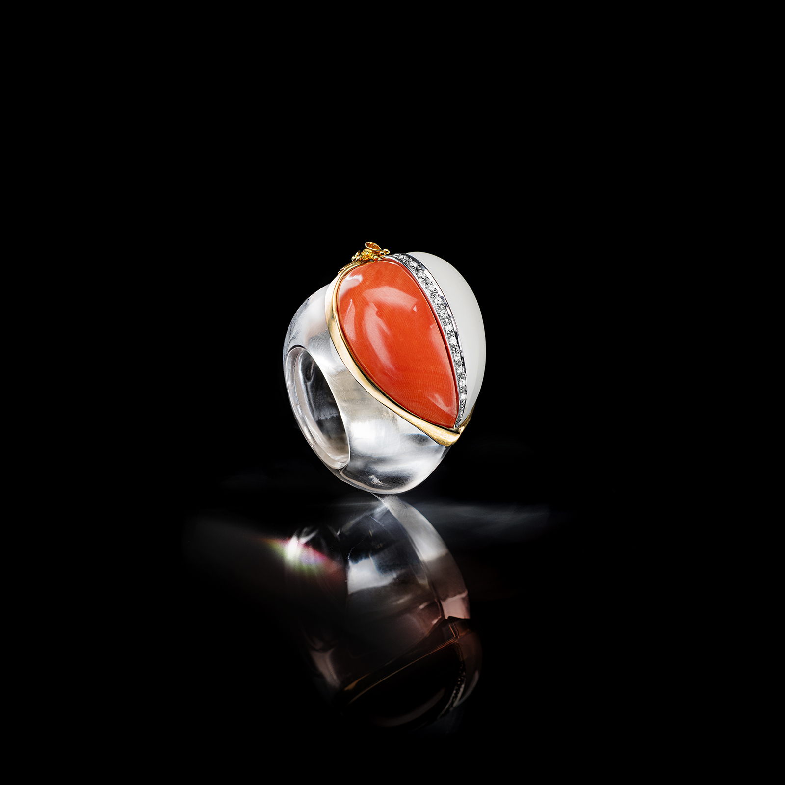 Anello in cristallo di rocca, con corallo Elatius e Secundum del Pacifico, di colore rosso e bianco, e fascia di diamanti in 0,12 kt.