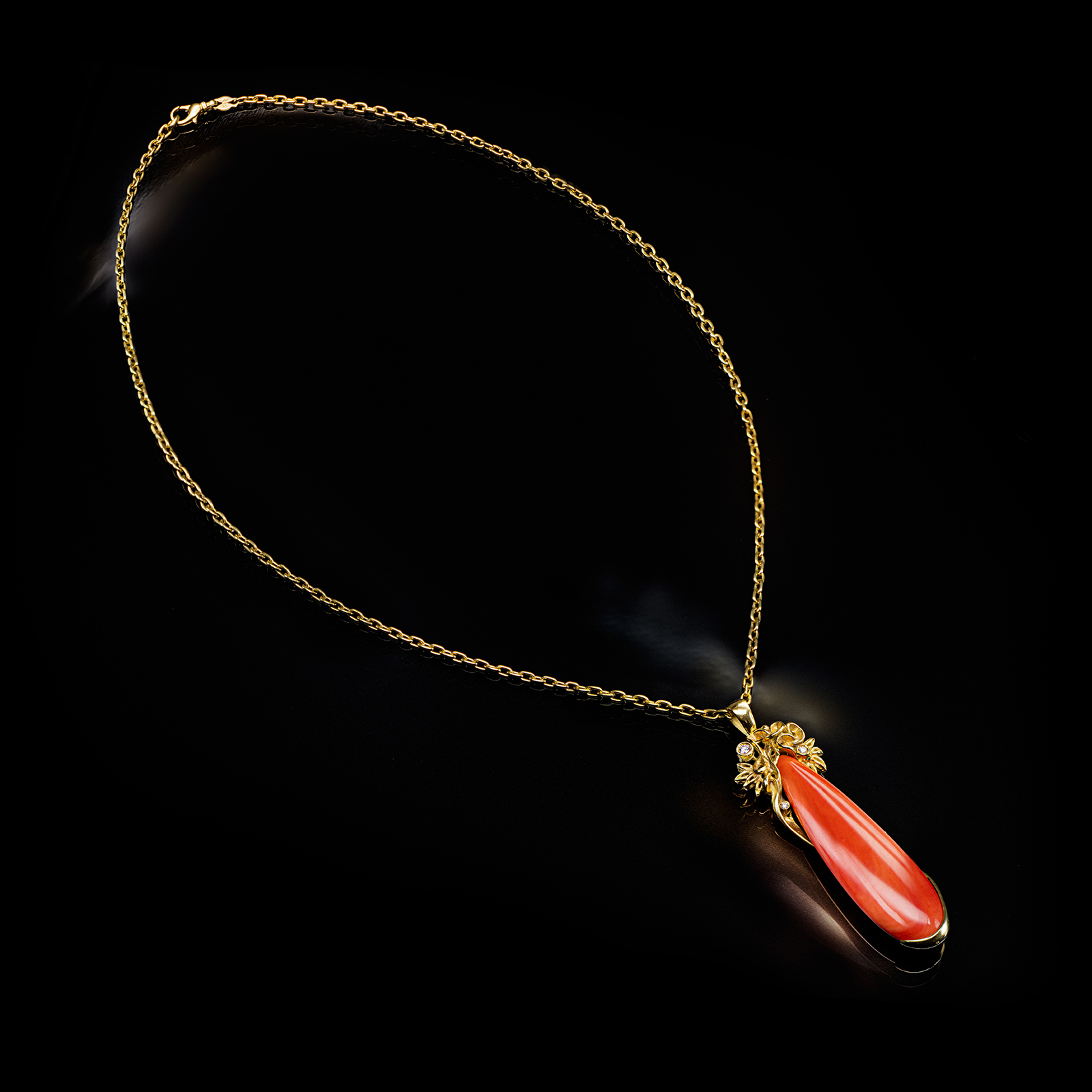 Pendente a forma di goccia in corallo Elatius del Pacifico, di colore momo, con oro 18 kt e diamanti 0,1 kt.