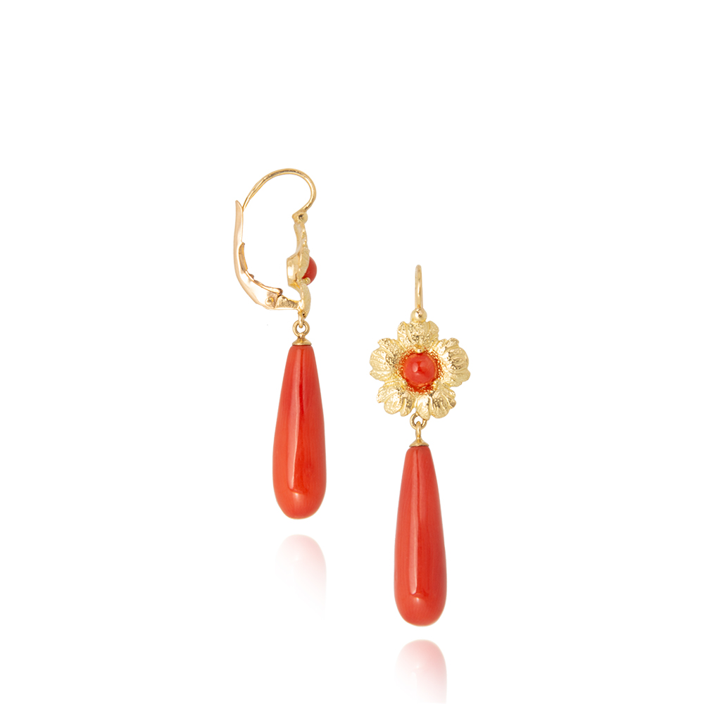 Gli orecchini firmati Thomas Hunt per la collezione Designer si ispirano al mondo floreale: due sfere di corallo rosso sono incastonate in petali d’oro, dai quali, come rugiada, scivolano lunghe gocce di corallo.