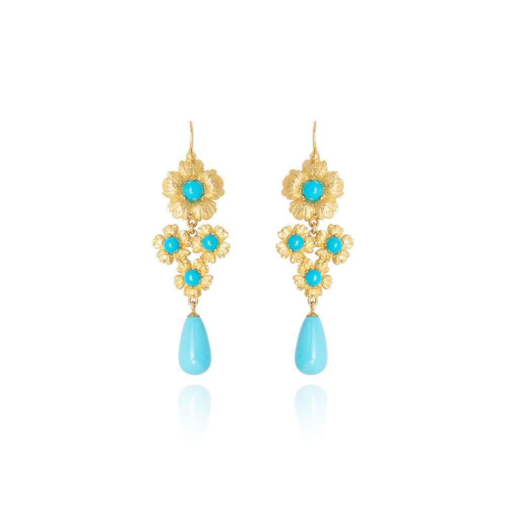 Gli orecchini firmati Thomas Hunt per la collezione Designer si ispirano al mondo floreale: sfere di turchese sono incastonate in delicati petali d’oro, dai quali, come rugiada, scivolano gocce di turchese.