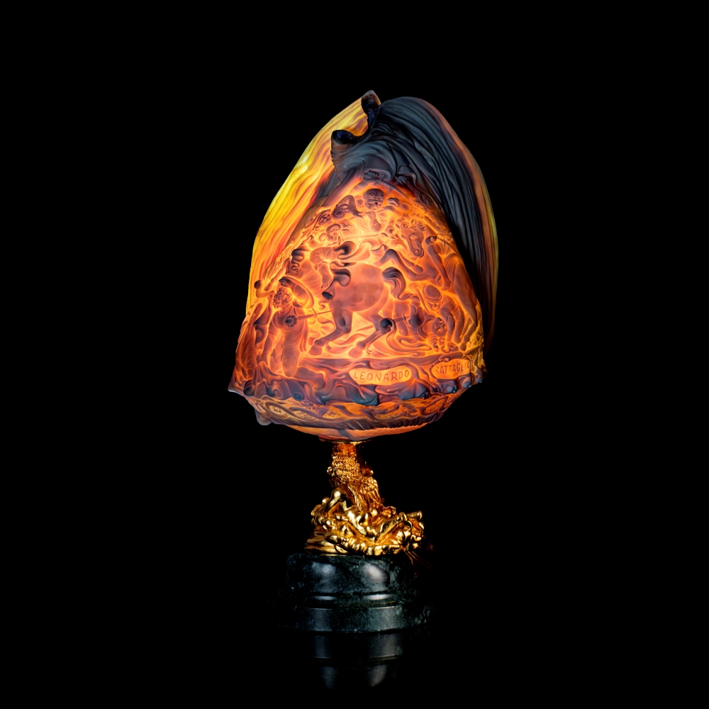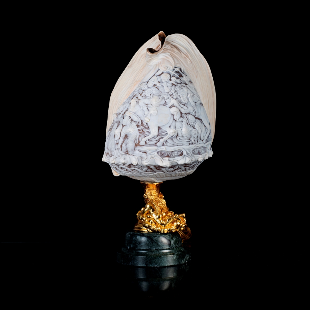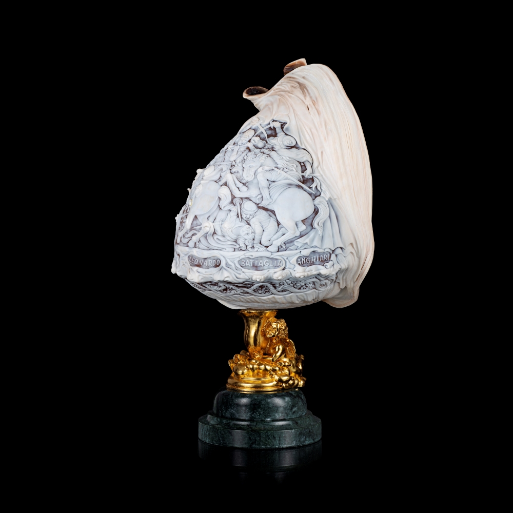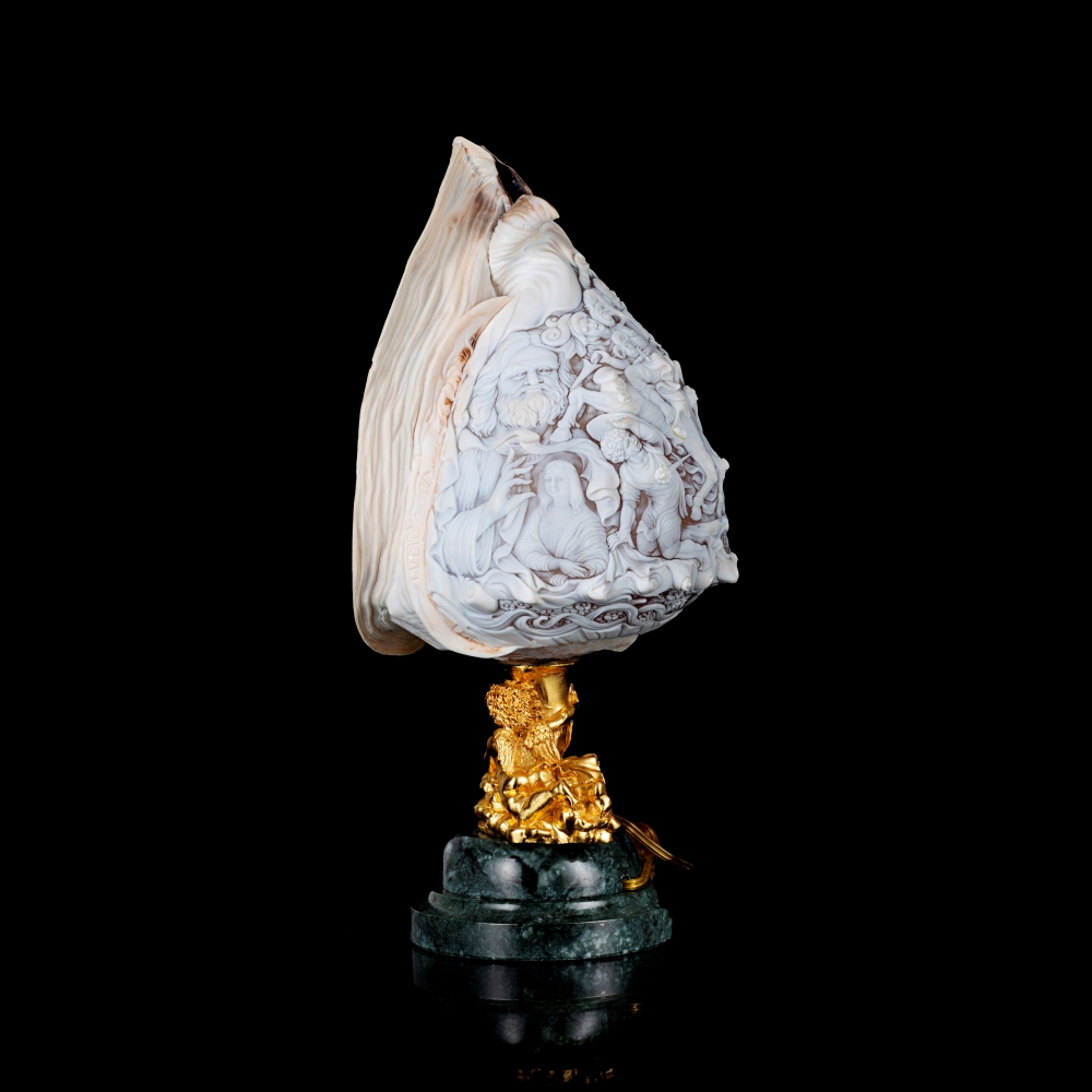 Il forte contrasto cromatico tra l’esterno e l’interno degli strati della conchiglia mette in evidenza la rappresentazione scolpita, creando il modello dalla superficie inferiore, come un bassorilievo. Questo contrasto crea una grande luce e un effetto ombra, enfatizzando la profondità e le forme dell’intera rappresentazione.