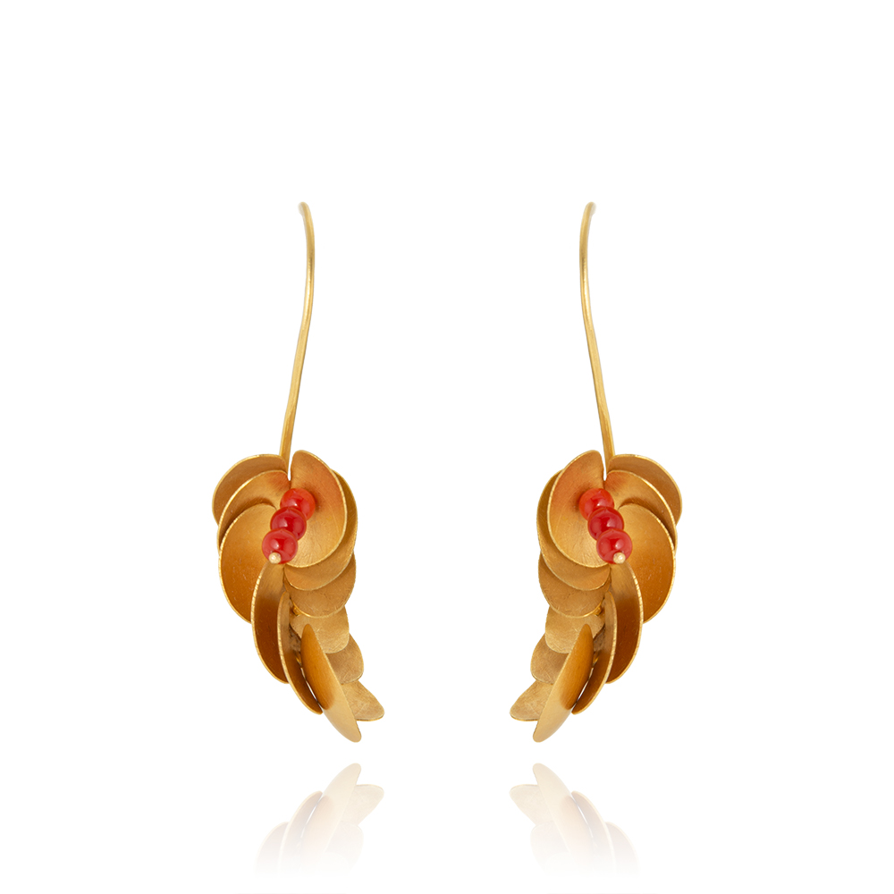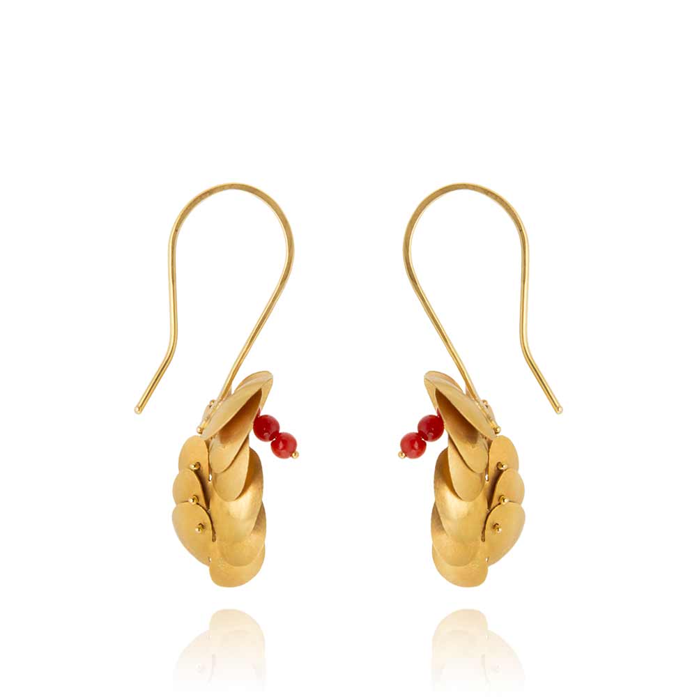 Sinuose foglie d’oro abbracciano le perline di corallo rosso in una danza estatica di raffinatezza ed eleganza.
