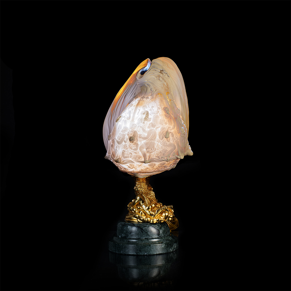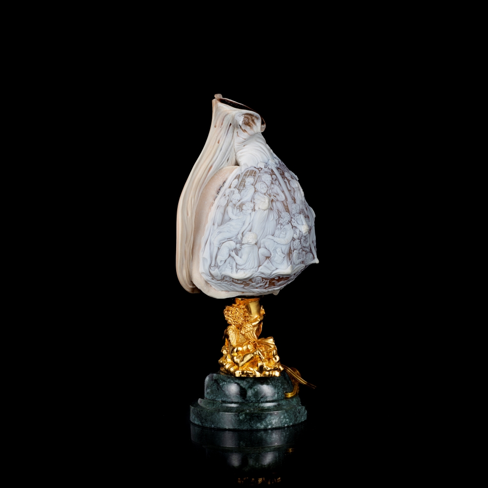 Il forte contrasto cromatico tra l’esterno e l’interno degli strati della conchiglia mette in evidenza la rappresentazione scolpita, creando il modello dalla superficie inferiore, come un bassorilievo. Questo contrasto crea una grande luce e un effetto ombra, enfatizzando la profondità e le forme dell’intera rappresentazione.