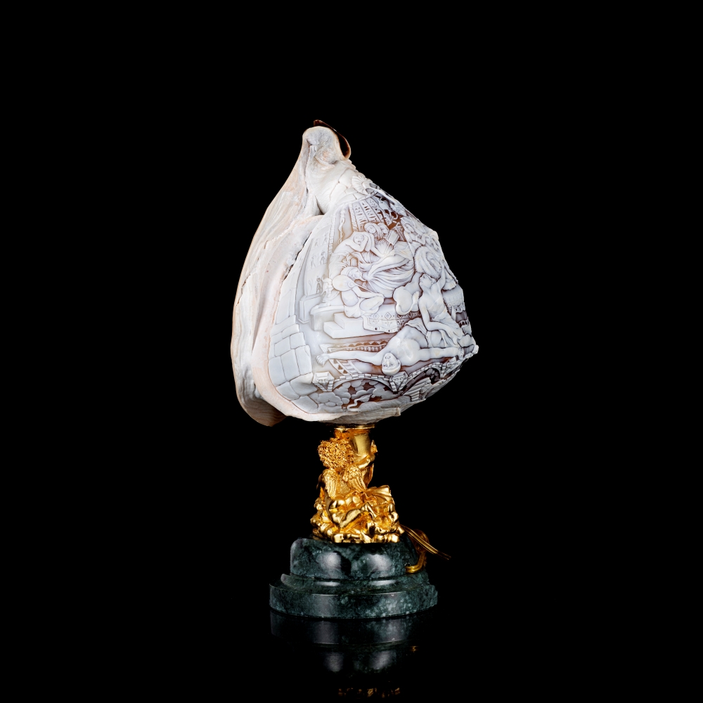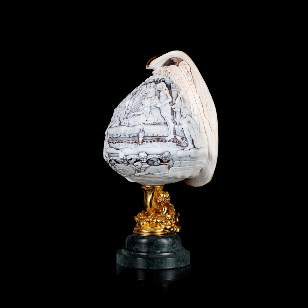 Il ricordo del suo laboratorio è ancora vivo nella sua mente, l’odore della pece, il rumore ritmico del bulino sui cammei in conchiglia, a volte di taglia grande, usati per orecchini e anelli, le sue grandi e ruvide mani, la sua gentilezza e la sua umiltà.