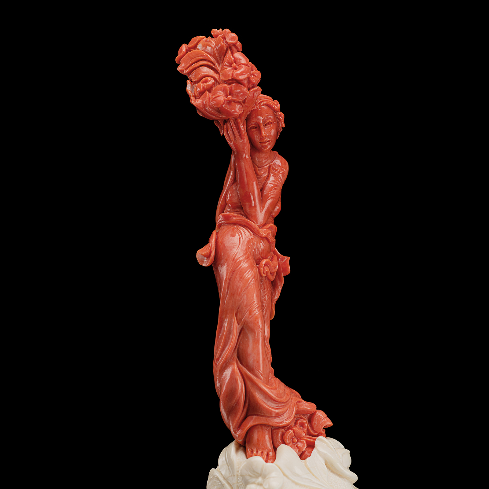 Statuina in Corallo Salmone del Pacifico su base in Cristallo di Rocca