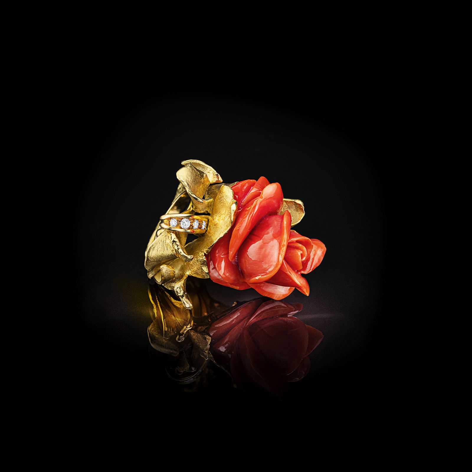 Collier in oro 18 kt, diamanti 1,6 kt e cabouchon inciso in corallo Elatius del Pacifico, di colore momo.